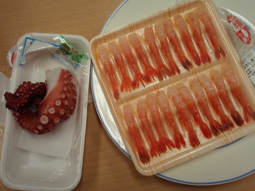 My dinner today: Ebi (shrimps) and a big octopus tentacle, unbelievable good.