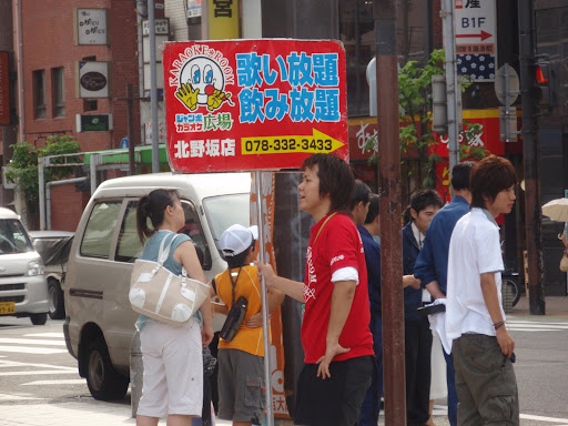 In Japan promotion for pubs and the like is often still carried out by puffers on the street. First and foremost they are used for promoting Karaoke-bars and eateries (which are here more or less substituting for our inns). It is really interesting to yet see this kind of advertisement, for at home it virtually has been completely replaced by the handing out (sometimes quite aggressively) of flyers.