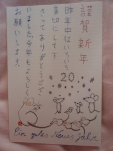Second picture: Written by myself, attention, read from right to left. The red writing (kingashinnen) means "A happy New Year" and is a little old polite/courtly expression, which is nearly exclusively used in written language. In colloquial language other are in use but I simply like it traditional. The blue writing's meaning is approximately: "I thank you for your help (assistance, for everything), that you have done for me during the last year and hope that this year too our relationship will stay a good one." (not literally translated). Since the year of the mouse is around the corner, below that the usual mouse-motifs, although the ones on the right I drew myself. Indeed when it comes to art, drawing, painting etc., except music, I'm normally an absolutely untalented failure but I think those I managed to draw quite decent, though unfortunately the photo is too blurred as to one could make out the snow flakes well. As to why over the mice the year 20 is presented instead of 2008, that is part of the Japanese method of counting and I will explain it another time (ah, smells like "Supplement" part 2!)