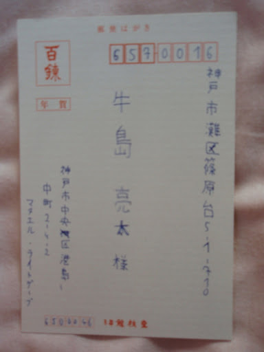 First picture: The 2 horizontal characters in the left upper-most corner account the card as New Years card, in that the post delivers it exactly on January 1st. If someone has a blank card one needs to add those or else it gets delivered earlier, which isn't that good, since the Japanese most rejoice if it arrives precisely on January 1st.